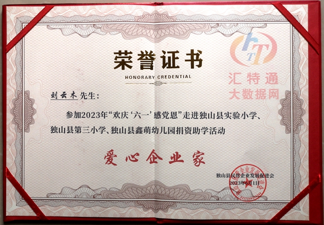 贵州省黔南州独山县民营企业发展促进会举行2023年欢庆六一儿童节,感党恩,走进独山县实验小学,独山县第三小学,独山县鑫萌幼儿园进行捐款献爱心助学活动,贵州汇特通信息网络科技有限公司刘云木参与捐款,民营企业发展促进会为了感谢各位会员的爱心贡献,并授予刘云木为爱心企业家荣誉证书。